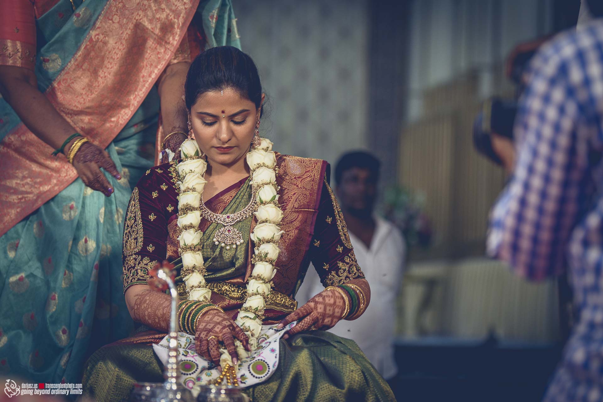 Panna młoda w Tamil Nadu najczęściej nosi tradycyjne sari, znane jako Kanchipuram sari lub Kanjeevaram sari ze względu na miejsce, gdzie je wyprodukowano. Są to najbardziej znane i cenione miasta, słynące ze swojej bogatej tradycji tkackiej. Wykonane są one z ciężkiego jedwabiu i bogato zdobione złotymi nićmi. Najpopularniejszymi kolorami sari są czerwień, złoto i odcienie zieleni, symbolizują one szczęście i dobrobyt. Nieodłącznym elementem tak bogatych sari jest biżuteria w tym kolie, bransolety, kolczyki, pasy odiyanam oraz ozdoby na włosy jadanagam. Warto też wiedzieć, że podczas dnia zaślubin, sari zmieniane jest kilkukrotnie. Ani jednego słowa nie napiszę o rytuale mehendi, czyli o przepięknych wzorach z henny na stopach i dłoniach panny młodej, wykonanych z precyzją i kunsztem, idealnie wpisujących się w magię tego wydarzenia już na kilka dni przed zaślubinami.